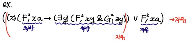 변항 α가 (α)φ 혹은 (∃α)φ도 꼴의 식 φ 속에 나타날 경우 오직 그 경우에만 α는 속박되어 나타난다. 그 밖의 경우에는 자유롭게 나타난다.