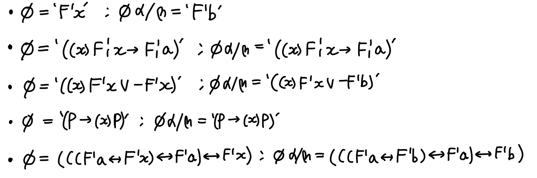 비록 ‘α’가 L의 변항이 아니고, ‘β’가 L의 개체기호가 아니라 할지라도, α가 L의 변항이고, β가 L의 개체상항이고, φ가 L의 식이고, 그리고 φα/β가 φ와 같은 그러한 α,β, 그리고 φ가 존재한다.