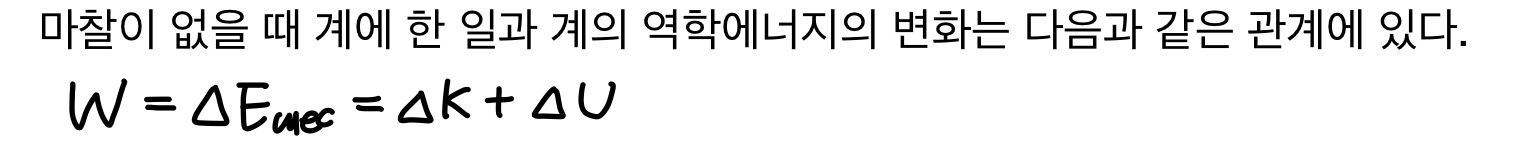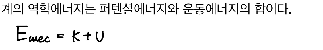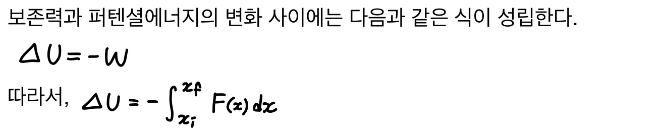보존력이 계의 내부에 있는 물체에 일 W를 할 때 힘은 계의 운동에너지 K와 퍼텐셜에너지 U 사이에 에너지 전환을 일으킨다.