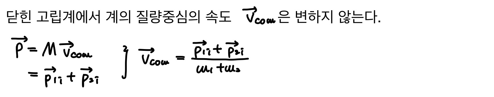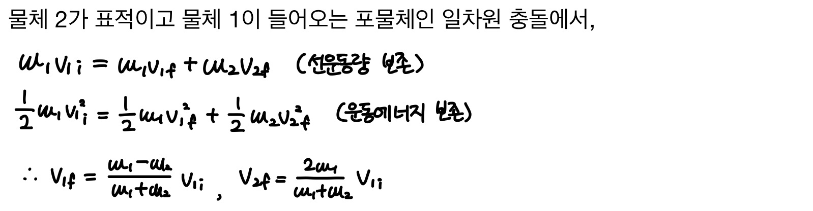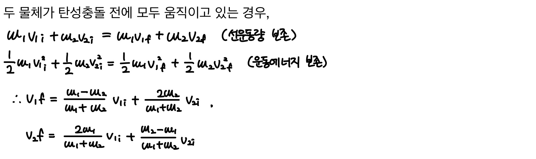 닫힌 고립계에서 운동량 보존법칙을 적용하고, 충돌이 탄성충돌이라면 운동에너지 보존법칙을 사용한다.