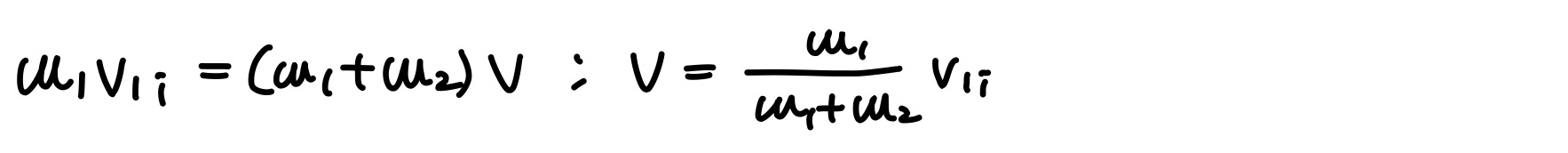두 물체의 완전 비탄성충돌에서 질량 m2의 물체가 처음에 정지해 있고(표적) 질량 m1의 물체가 다가와(포물체), 충돌 후 두 물체가 붙어 V의 속력으로 함께 움직인다면