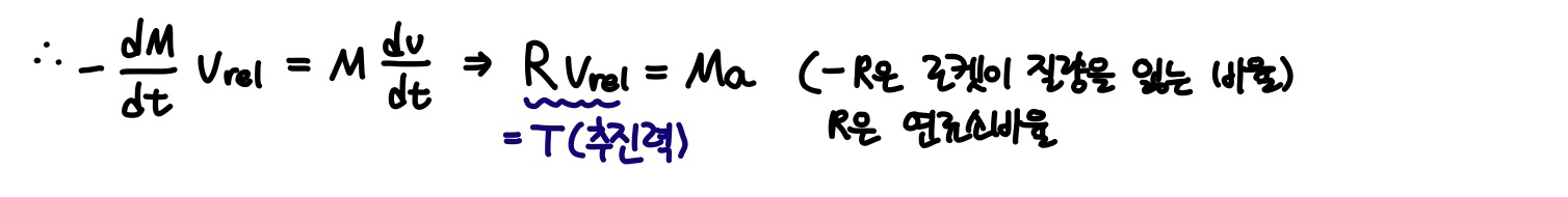 로켓과 배기물 사이의 상대속력 Vrel을 사용하면,