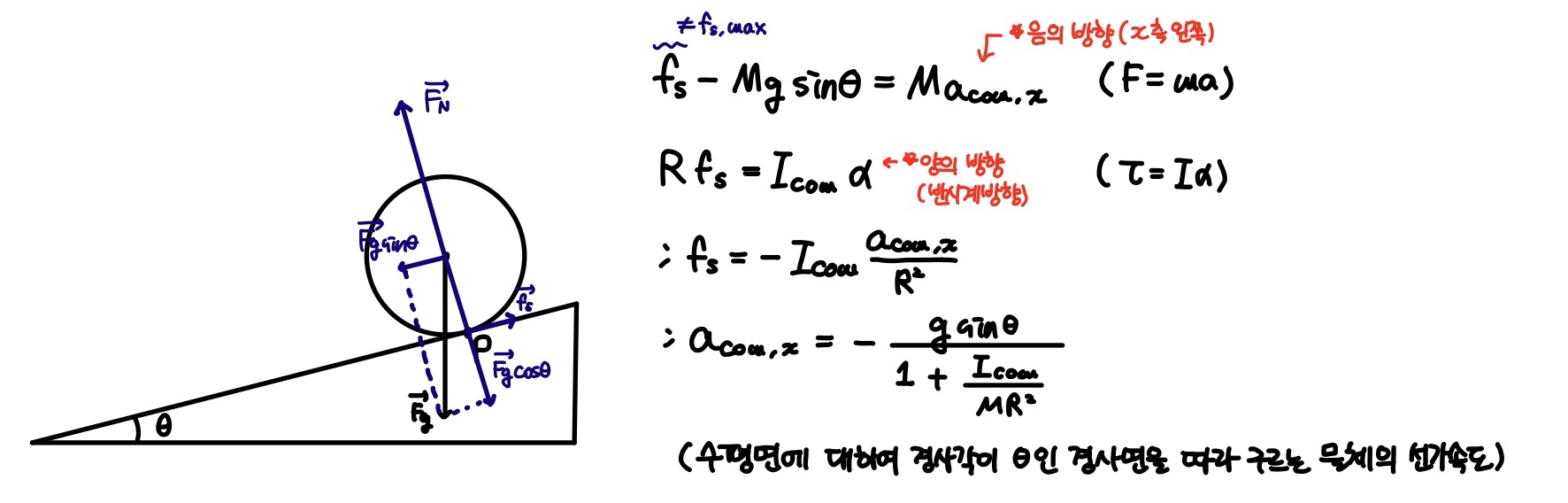알짜힘이 작용할 때 바퀴가 미끄러진다면 접촉점에 작용하는 마찰력은 운동마찰력 fk이고 이때는 식 a=αR을 적용할 수 없다.