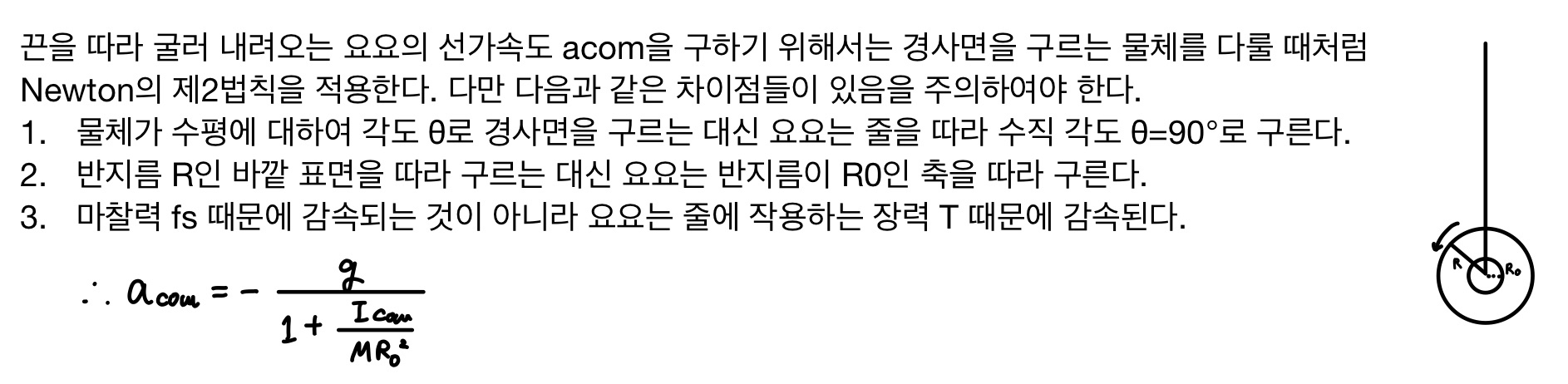 요요를 거리 h만큼 풀어서 굴러 내리게 하면 mgh만큼의 퍼텐셜에너지를 잃는 대신 병진운동에너지(1/2mv^2)와 회전운동에너지(1/2Iω^2)를 얻는다. 요요가 튀어 올라올 때는 운동에너지를 잃고 퍼텐셜에너지를 다시 얻는다.